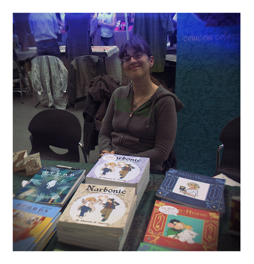 Seated behind large stacks of book-length collections of her webcomics Narbonic and Skin Horse, along with the work of her fellow artists in the Couscous Collective group, Garrity fielded questions about her work, stopping now and then to process a sale or inscribe a book for a fan. She speculated that the park’s location — as opposed to the show’s older venues in trendier areas of the city, including the CELLspace gallery in the media gulch area and the Women’s Building the Mission district — might be the reason why more families are attending the show.